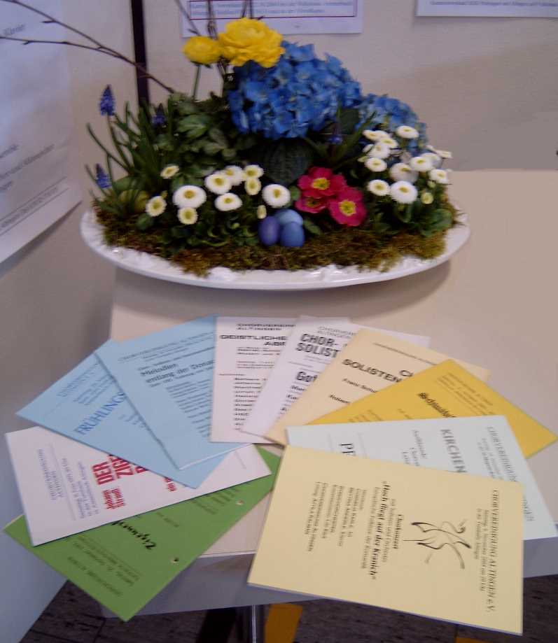 2001 Kirchenkonzert St. Magnus-Kirche 2001 Kirchenkonzert St.Stephanus-Kirche 2003 Psalmenfestival 2003 Sommerserenade 2004 Europ. Volklore, Hoch fliegt auf der Kranich 2005 Sommerserenade 2006 Jubiläumskonzert 2008 Kirchenkonzert 2010Sommerkonzert „ Liebe, Wein und Wandern“ 2011 Jubiläumskonzert 2014 Kirchenkonzert 2014 Geistliche Abendmusik 2016 Frühjahrskonzert 2017 Konzert in der Gemeindehalle 2019 Konzert in der ev. Kirche
