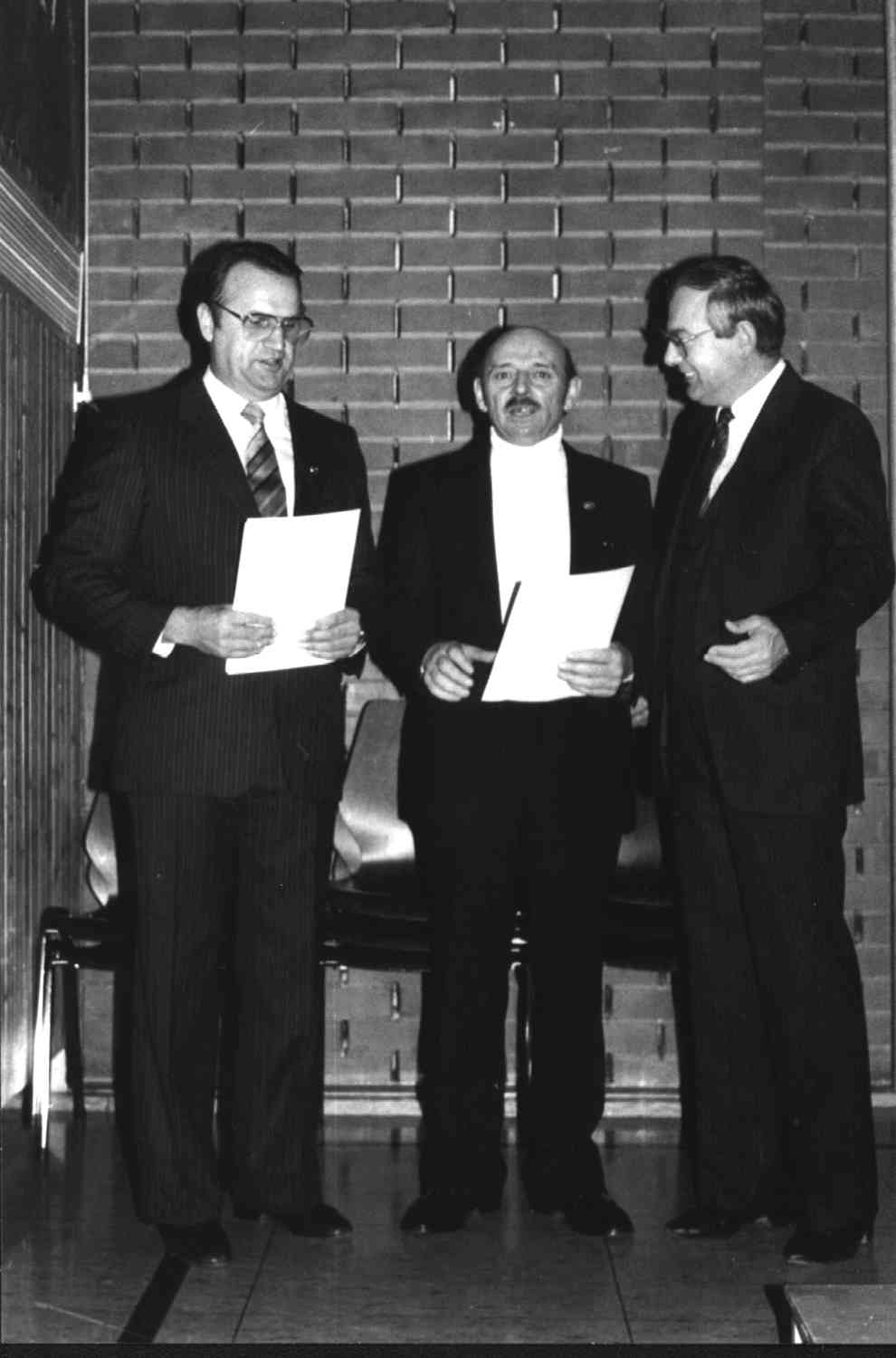 Vorstand Ernst Unsöld und Chorleiter Rudolf Haas erhalten am 6. 10.1984 aus der Hand von Bürgermeister (a.D.) Hugo Dieter für besondere Verdienste die Ehrennadel des Landes Baden-Württemberg ausgehändigt.